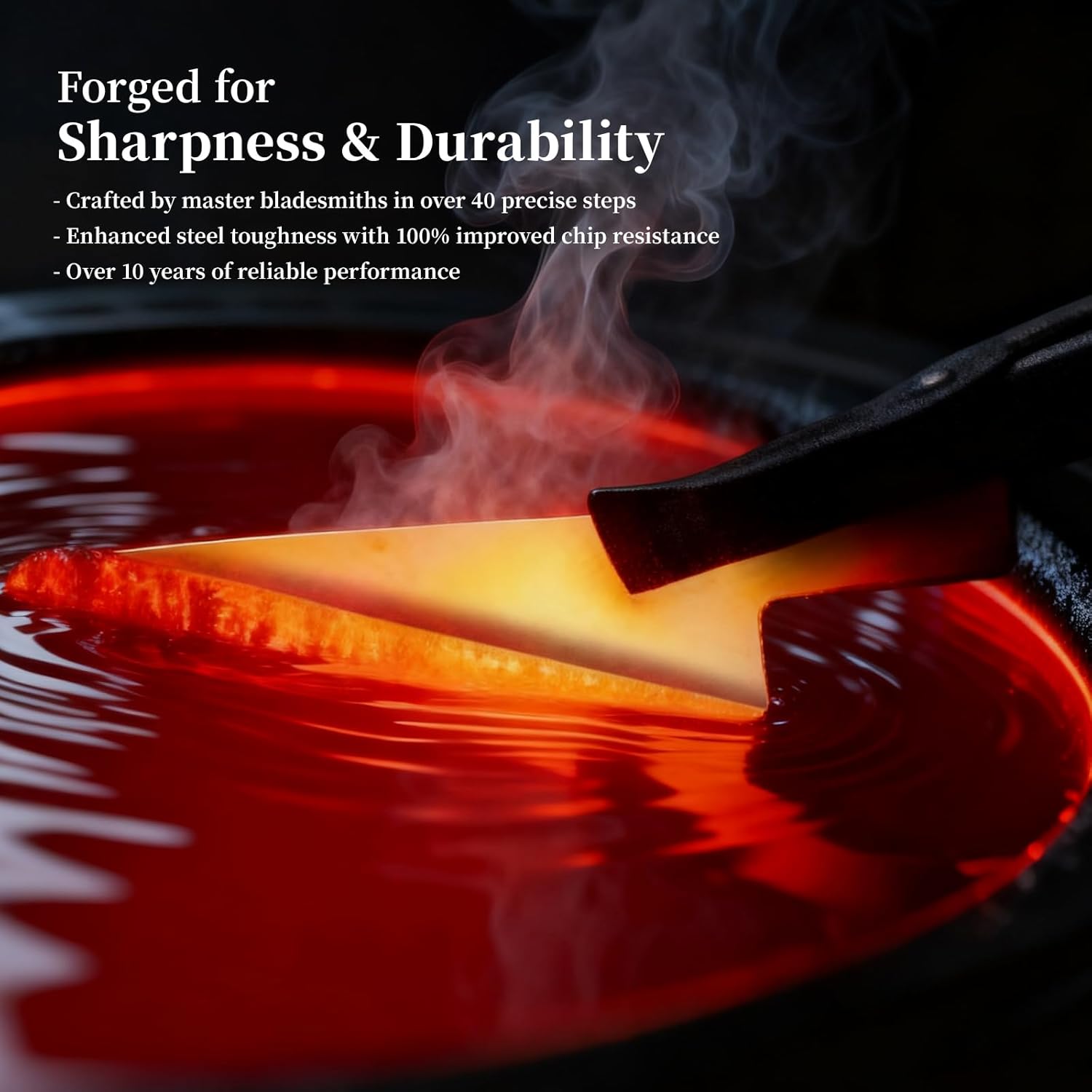 [ VG-10 Core with Lasting Sharpness & Safety ] Featuring Japanese VG-10 steel core (60-62 HRC), this kitchen knife maintains razor sharpness for 180 days. Sanmai triple-layer structure reduces chipping risk by 90%, boosting efficiency in slicing, shredding, and dicing all kinds of vegetables
