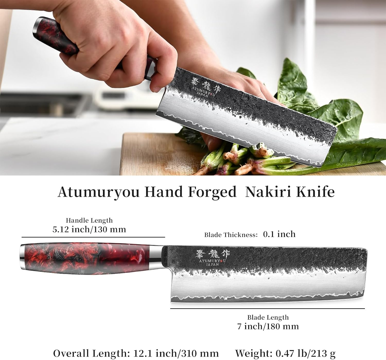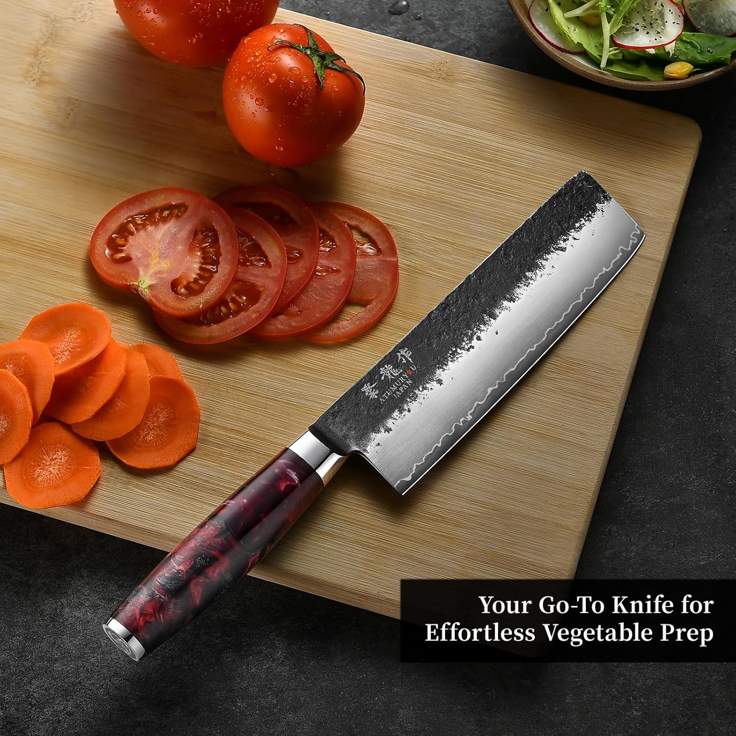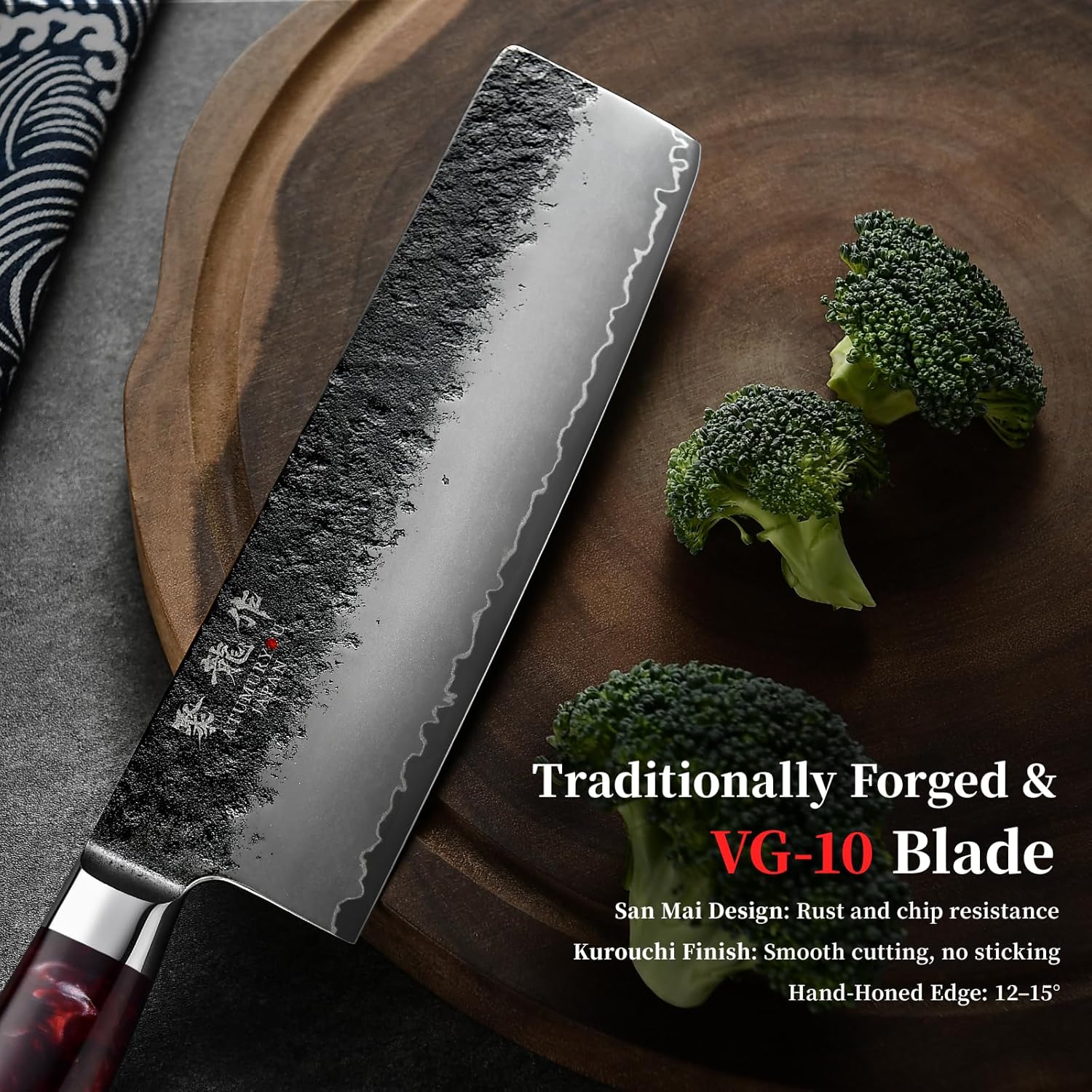 Japanese Nakiri Knife, 7 Inch Hand Forged Chef Knives with VG10 Steel, Professional Kitchen Knives, Ultra Sharp Vegetables Knife with Ergonomic Red Handle, Cooking Gifts for Men and Women