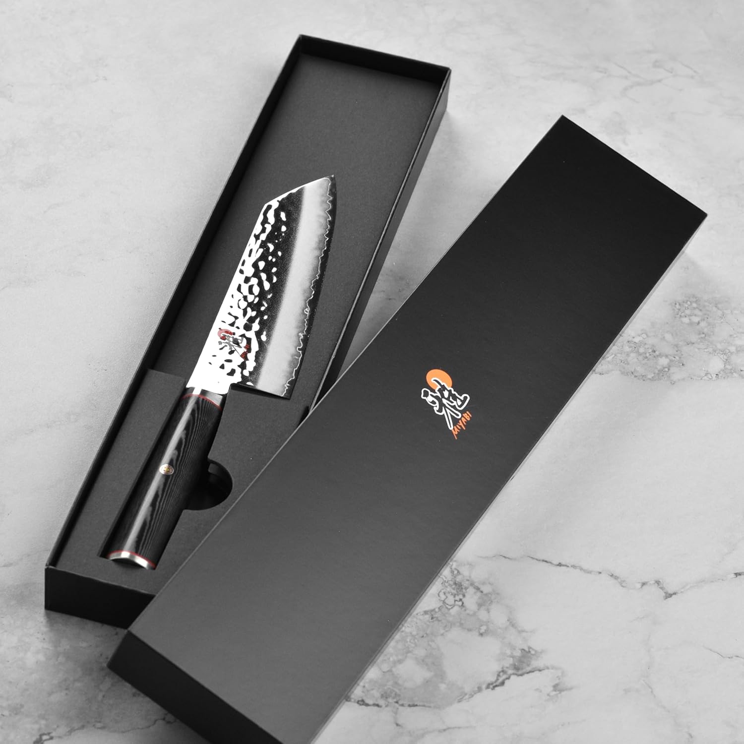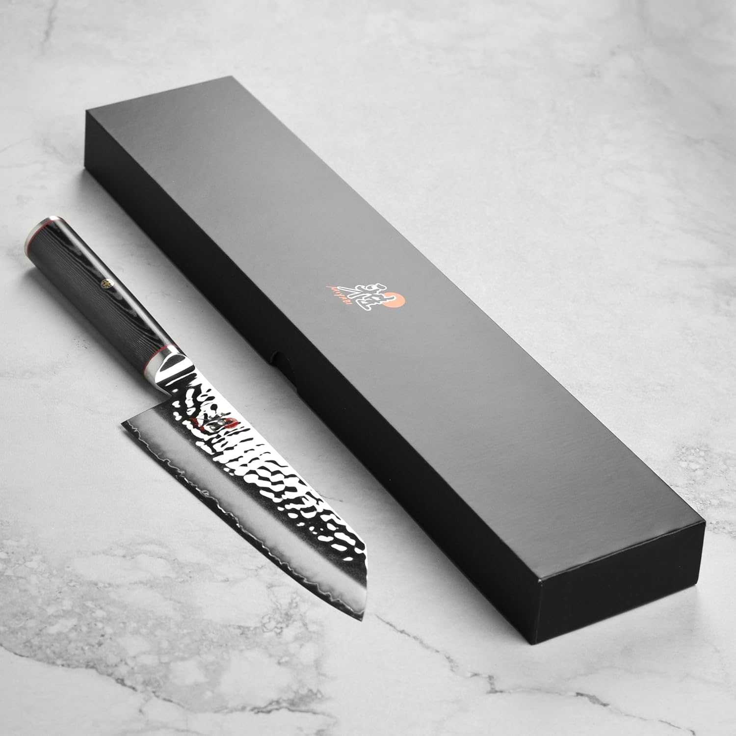 Designed for versatility, the Miyabi Mizu SG2 Bunka Knife features a flat edge and angled tip ideal for precise slicing, chopping, and detailed vegetable or protein prep. The making of Miyabi Mizu knives start off with the Tsuchime method, consisting of 3-layers of SG2 steel with a hammered finish to allow food from sticking to the blade. Next, the Honbazuke process involves the Katana edge being sharpened with an ancient 3-step process, which sharpens the blade twice on whetstones, followed by mirror polishing on a leather wheel. This process was used over 1000 years ago for samurai swords to create the ultimate sharpness. The Criodur process gives the steel hardness for blade retention, flexibility, and highly corrosion resistant. To deliver the outstanding performance, the blade is hand-honed at the traditional Japanese blade angle of approximately 12 degrees on each side, which results in a scalpel-like sharpness. This outstanding performing blade is complimented by a stunning durable D-shaped Micarta handle, featuring a mosaic pin, red spacers, and a metal end-cap with logo that adds balance. Handcrafted in Seki, Japan.