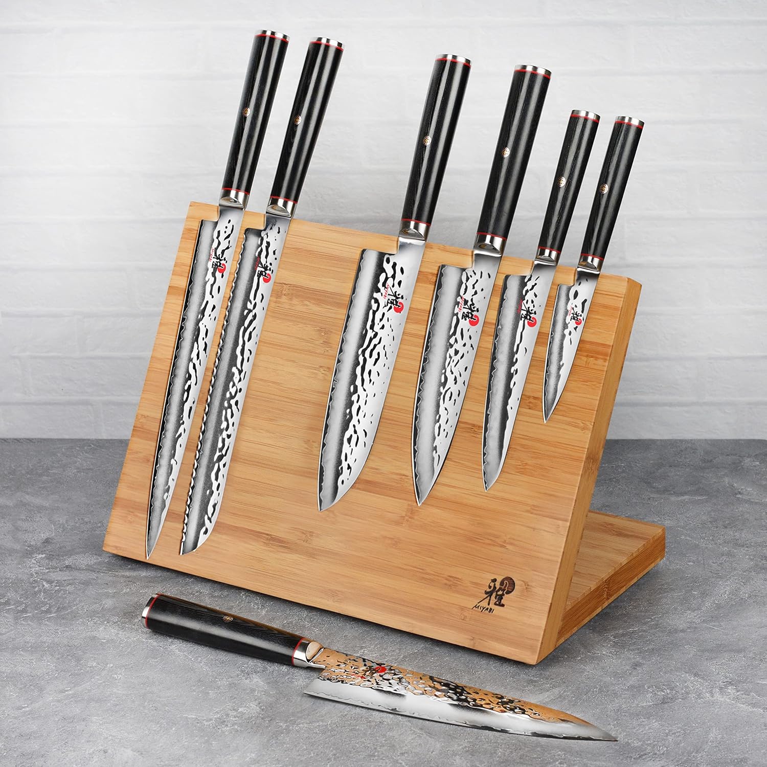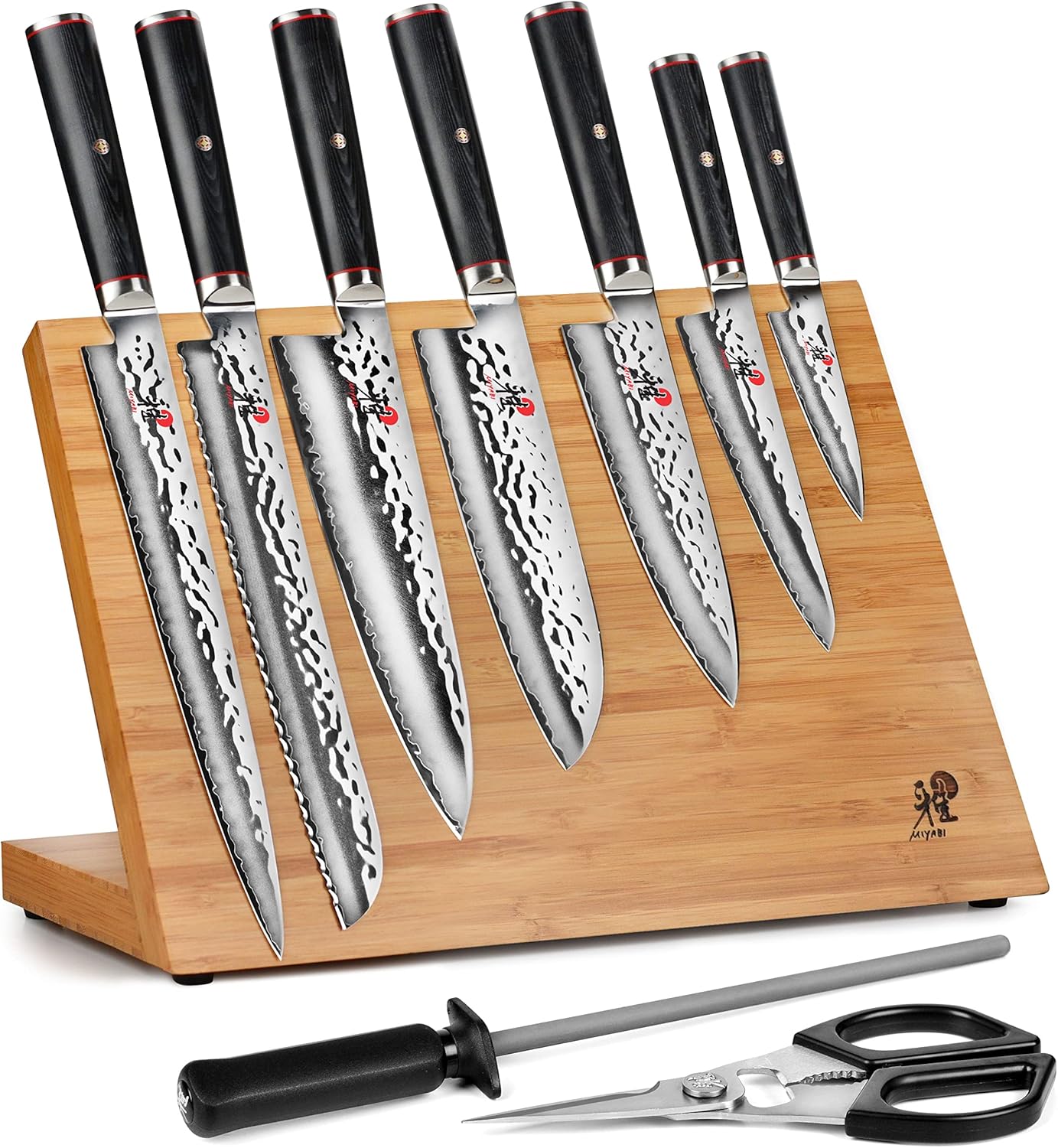 Miyabi knife set includes 3.5″ Paring Knife, 5.5″ Prep Knife, 6″ Chef’s Knife, 7″ Santoku Knife, 8″ Chef’s Knife, 9″ Bread Knife, 9.5″ Slicing Knife, 9″ Tungsten Sharpening Steel, Miyabi Kitchen Shears & Bamboo Magnetic Easel Knife Block