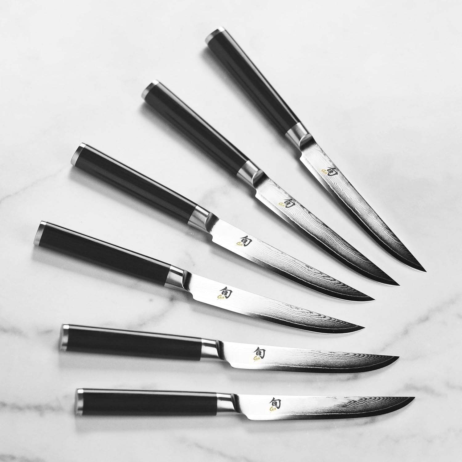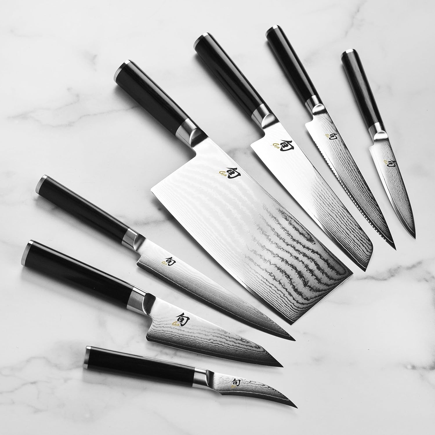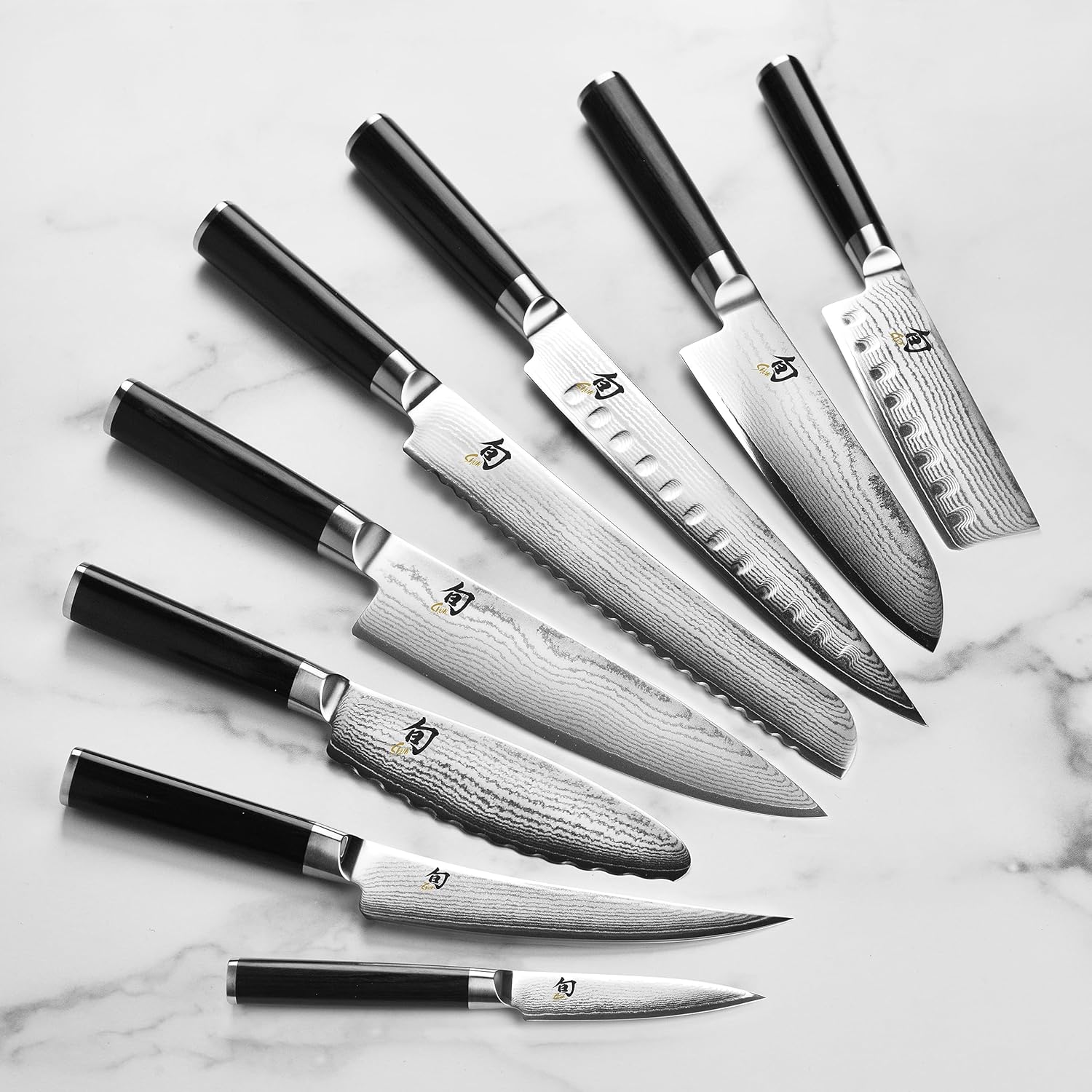 Shun Classic Set includes 2.5″ Bird’s Beak Peeling Knife, 3.5″ Paring Knife, 4″ Paring Knife, 4.5″ Honesuki Knife, 5″ Hollow Edge Nakiri Knife, 6″ Serrated Utility/Tomato Knife, 6″ Ultimate Utility Knife, 6″ Utility Knife, 6.5″ Master Utility Knife, 7″ Chinese Vegetable Cleaver, 7″ Santoku Knife, 8″ Chef’s Knife, 9″ Bread Knife, 9″ Hollow Edge Slicing Knife, Six 5″ Steak Knives, 9″ Combination Honing Steel, Premium Take-Apart Kitchen Shears & 22 Slot Bamboo Knife Block