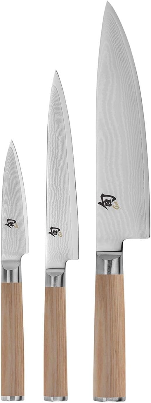 Shun Classic Blonde 3 Piece Starter Set, Includes 8″ Chef, 3.5″ Paring & 6″ Utility Knives, Handcrafted Japanese Knife Set, Damascus Stainless Steel Cladding, Pakkawood Handle