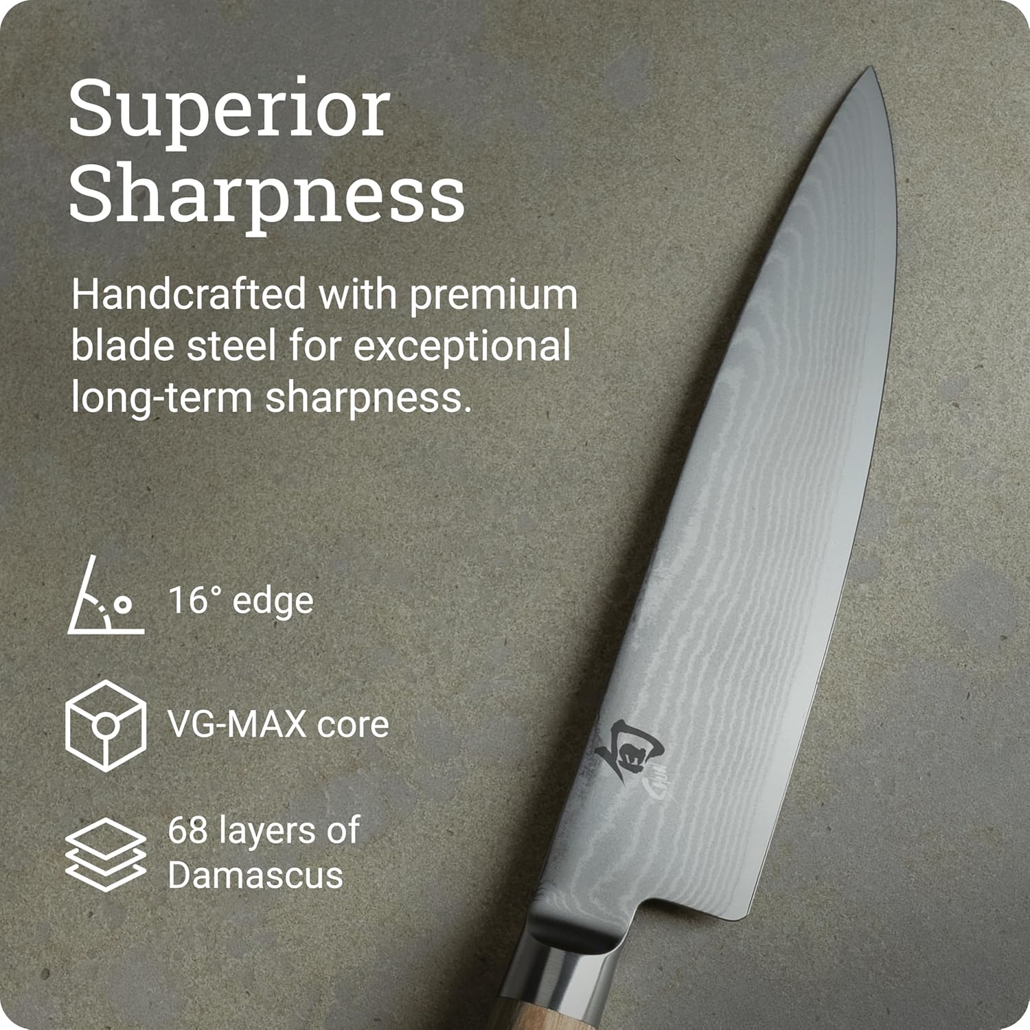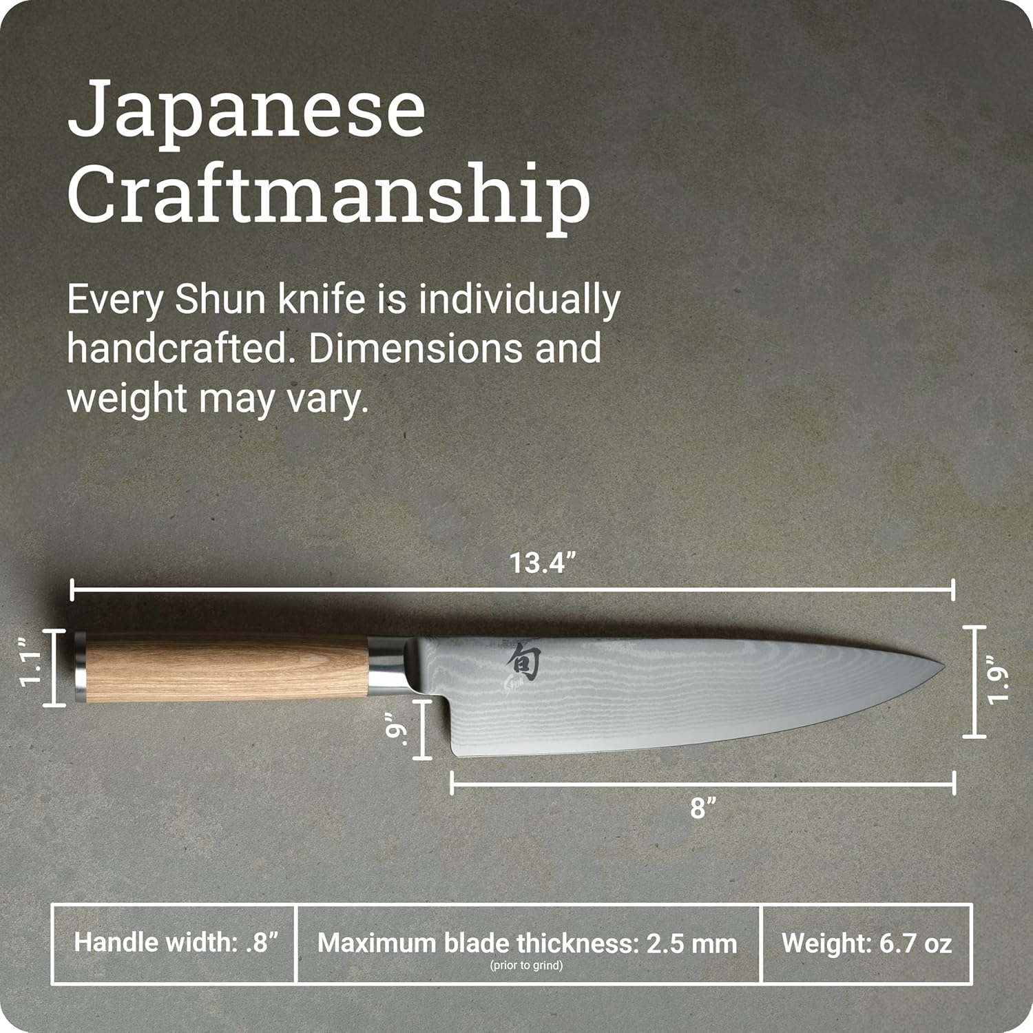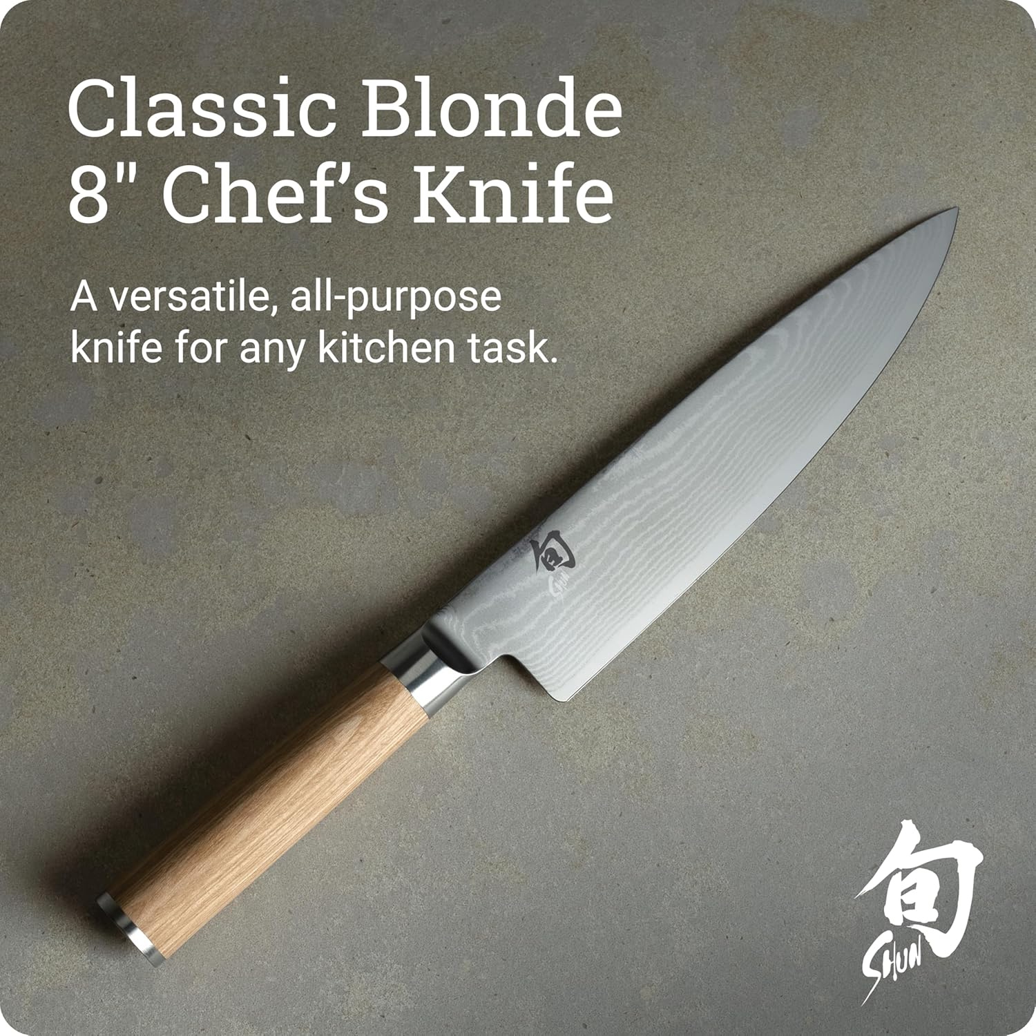 Shun Classic Blonde 8″ Chef’s Knife, Handcrafted Japanese Kitchen Knife for Professional and Home Chefs, VG-MAX Core with Damascus Stainless Steel Cladding, Pakkawood Handle