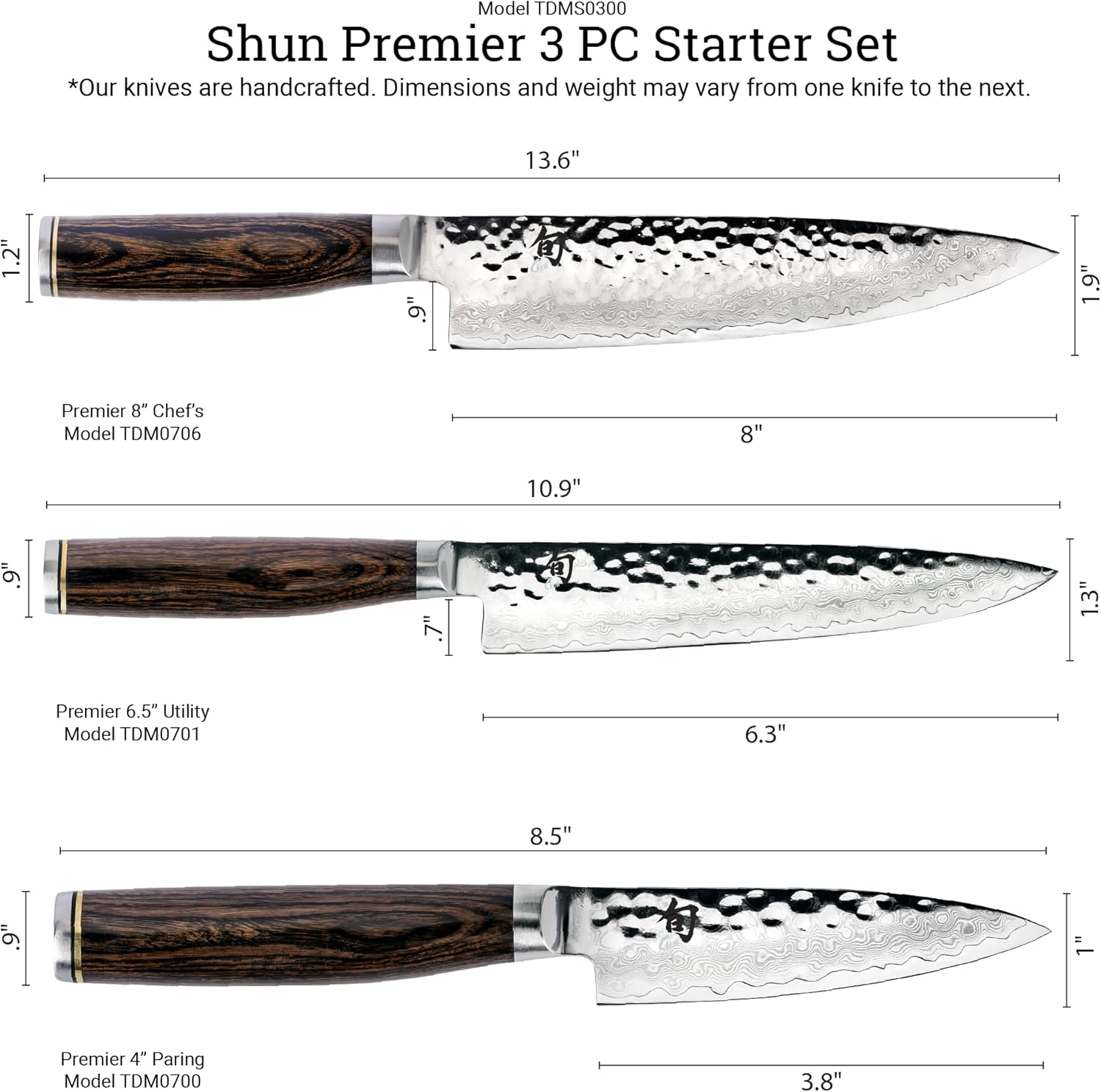 The Shun Cutlery Premier 3-Piece Starter Set is the perfect start to your cooking knife collection. This set includes the Premier 8-inch Chef’s Knife, 4-inch Paring Knife, and 6.5-inch Utility Knife. Premier knives feature Shun’s proprietary VG-MAX cutting core with 68 layers of Damascus cladding and a hammered TSUCHIME finish. The razor-sharp, 16-degree blade is wear- and corrosion-resistant and holds a fine edge. The contoured, walnut-finished Pakkawood handle is beautiful, moisture-resistant, and comfortable to use.