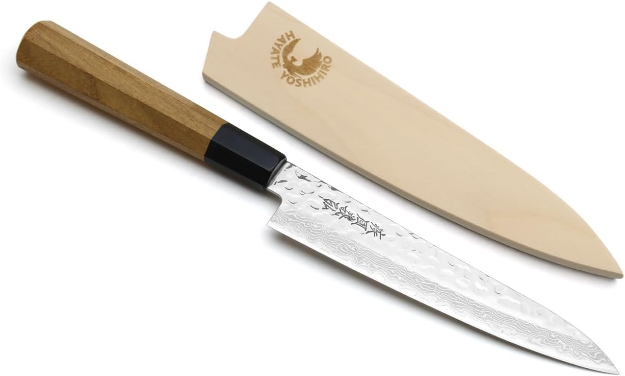 Proudly made in Japan. This knife is complimented with a traditional Japanese Wa-style handcrafted Octagonal Handle that is lightweight and ergonomically welds to the hand for seamless use. A protective wooden sheath called a Saya is included, which protects the knife and adds to its appearance when not in use. The hammered texture of the blade eliminates friction and keeps food from sticking to the blade.