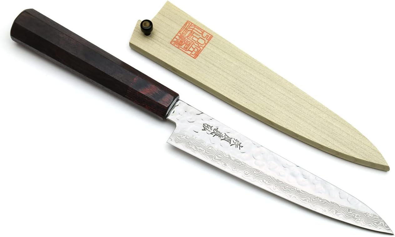 Knife Specifications VG-10 Steel Core. (HRC 60) Hammered Damascus Steel cladding Stain Resistant Spine Thickness: 2.5mm Japanese-Style Rosewood Handle A Single Redwood Bolsters Magnolia Knife Sheath Saya Handcrafted in Japan