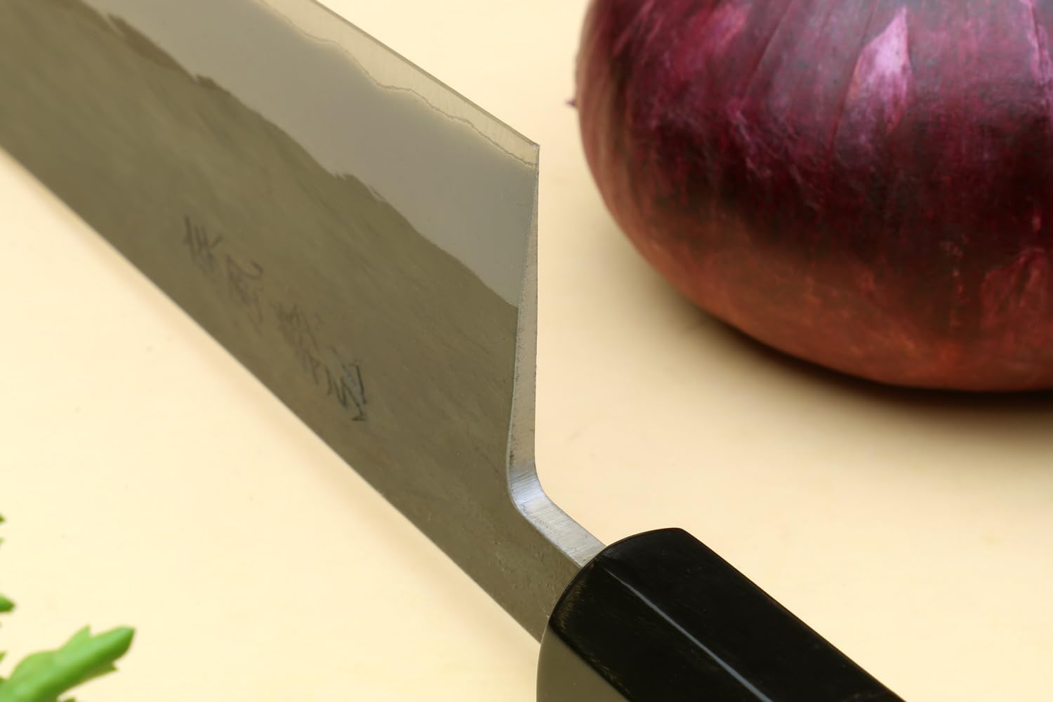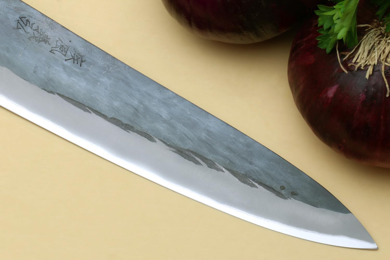 Traditional Japanese knife making values a sharp edge, which requires attention and care. Sharpening and honing should be done with only water whetstones. Hand wash and dry only, and do so immediately if working with acidic ingredients. Do not use on objects such as bones, nutshells, and frozen foods. Carbon steel can oxidize if not properly maintained. Keep dry and oil regularly to prevent oxidation along the knife’s edge.