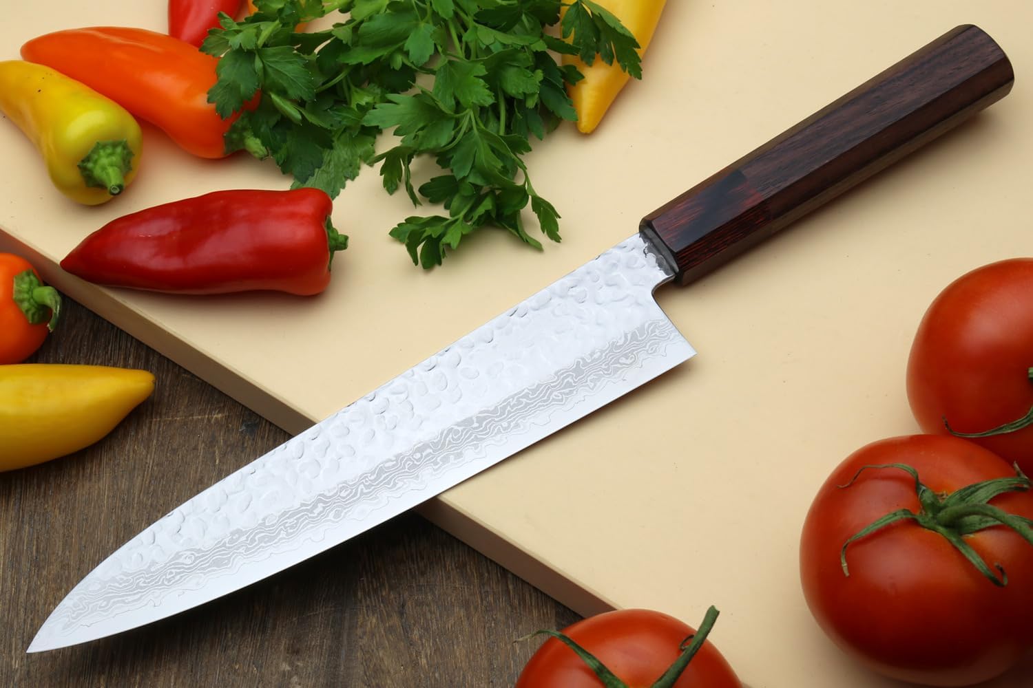Blade Material: VG10 Stainless Steel / Edge Angle: Double Edged / Grade: Hammered Damascus / Handle Shape: Octagonal / Handle Material: Shitan Rosewood / HRC: 60 / Knife Style: Gyuto Chef Knife / Saya Cover: Natural Magnolia Wood / Stain Resistant: Yes / Made in Japan